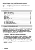 - Page 2: Welcome to AEG! Thank you for choosing our appliance. Before the installation and use of the appliance, carefully read the supplied instructions. The manufacturer is not responsible for any injuries or damage that are the result of incorrect installation or usage. Always keep the instructions in a safe and accessible location for future reference. This appliance can be used by children aged from 8 years and above and persons with reduced physical, sensory or mental capabilities or lack of experience and knowledge if they have been given supervision or instruction concerning the use of the appliance in a safe way and understand the hazards involved.