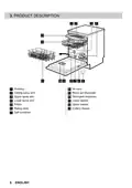 - Page 5: Product description includes various components of the appliance. Key parts mentioned are the worktop, air vent, rinse aid dispenser, and detergent dispenser. The document also lists the lower basket, upper basket, ceiling spray arm, upper spray arm, and lower spray arm. Additional components include filters, rating plate, salt container, and cutlery drawer.