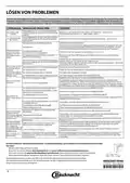 - Page 16: Lösen von Problemen Falls Ihr Geschirrspüler nicht richtig funktioniert, versuchen Sie, das Problem anhand der folgenden Liste zu beheben. Für andere Fehler oder Probleme wenden Sie sich bitte an den autorisierten Kundendienst. Mögliche Ursachen Salzbehälter leer. Lösung Befüllen Sie den Behälter mit Salz. Klarspülbehälter leer. Befüllen Sie den Behälter mit Klarspüler. Das Gerät wurde nicht richtig eingesteckt. Schließen Sie den Netzstecker an. Die Gerätetür schließt nicht. Drücken Sie die Tür energisch, bis ein „Klicklaut“ zu hören ist. Das Display zeigt: 9 oder 12 und die LED EIN/AUS blinken rasch. Das Geschirrspüler pumpt das Wasser nicht ab. Der Ablaufschlauch ist geknickt. Prüfen Sie, dass der Ablaufschlauch nicht geknickt ist. Das Geschirr schlägt aneinander. Positionieren Sie das Geschirr korrekt. Der Geschirrspüler ist zu laut. Es hat sich zu viel Schaum gebildet. Der Geschirrspüler lädt kein Wasser. Sicherstellen, dass Wasser im Wassernetz ist oder der Wasserhahn läuft. Das Display zeigt: H, 6 und die LED EIN/AUS blinken rasch. Kontrollieren Sie die Wasserversorgung auf Lecks oder andere Probleme. Das Auslaufen des Waschmittels. Kleine Leckagen führen nicht zu einer Funktionsstörung der Maschine.