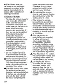 - Page 6: Make sure that the hoses do not get kinked, squeezed or crushed while placing the product into its location after installation or cleaning procedures. Do not install the product close to heat sources or under the cooking area of a hob. If the product is going to be used inside a wardrobe, keep the doors open during operation in cases where there are no openings to provide sufficient air circulation. Plug the product in a grounded socket protected by a fuse with current. Have the grounding installation made by a qualified electrician. Do not use the product without having the grounding made as per local/national regulations. Do not plug the product in sockets that are loose, dislocated, broken, dirty, greasy or bear the risk of getting in contact with water. Prior to installation, check if the product has any defects on it. Do not install the product in environments where the temperature falls below 0ºC. Place the product on a clean, flat and solid surface and balance it with adjustable feet.