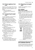 - Page 48: Customer service Protect appliance from frost If there is a risk of frost where the appliance will be standing, empty the appliance completely. Disposing of old appliance Valuable raw materials can be reused by recycling. Risk of harm to health! Children can lock themselves in the appliance, thereby putting their lives at risk. Transporting the appliance To avoid damage to the appliance, empty it before transporting. Always transport the dishwasher upright to prevent residual water getting into the machine's controls. This appliance is labelled in accordance with European Directive 2012/19/EU concerning used electrical and electronic appliances. The guideline determines the framework for the return and recycling of used appliances as applicable throughout the EU.