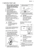 - Page 12: Before first use Make sure that the current level of the water softener agrees with the hardness of the water supply. If not, adjust the level of the water softener. Fill the salt container. Fill the rinse aid dispenser. Open the water tap. Start the programme 30 minutes to remove any residuals from the manufacturing process. Do not use detergent and do not put dishes in the baskets. Water and salt can come out of the salt container when you fill it. After you fill the salt container, immediately start a programme to prevent corrosion. Use rough salt designed for dishwashers only. Fine salt increases the risk of corrosion. The salt is used to recharge the resin in the water softener and to assure good washing results in daily use. The compartment is for rinse aid only. Do not fill it with detergent. Only use rinse aid designed specifically for dishwashers.
