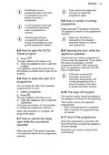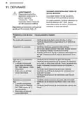 - Page 20: Problem and alarm code Possible cause and solution The level of water inside the appliance is too high. Switch the appliance off and on. Make sure that the filters are clean. Make sure that the outlet hose is installed at the right height above the floor. The lights related to MY TIME selection bar flash 15 times intermittently. An acoustic signal sounds intermittently. The appliance stops and starts more times during operation. It is normal. It provides optimal cleaning results and energy savings. The programme lasts too long. If the delay start option is set, cancel the delay setting or wait for the end of the countdown. Activating ExtraPower increases the programme duration. Small leak from the appliance door. The appliance is not levelled. Loosen or tighten the adjustable feet. The appliance door is not centred on the tub. Adjust the rear foot. The appliance door is difficult to close. The appliance is not levelled. Loosen or tighten the adjustable feet. Parts of the tableware are protruding from the baskets. The appliance door opens during the wash cycle. The AirDry function is activated. You can deactivate the function. Rattling or knocking sounds from the inside of the appliance. The tableware is not properly arranged in the baskets. Make sure that the spray arms can rotate freely. The appliance trips the circuit-beaker. The amperage is insufficient to supply simultaneously all the appliances in use. Check the socket amperage and the capacity of the meter or turn off one of the appliances in use. Internal electrical fault of the appliance. Contact an Authorised Service Centre. Once you have checked the appliance, deactivate and activate the appliance. If the problem occurs again, contact an Authorised Service Centre. WARNING! We do not recommend using the appliance until the problem has been completely fixed. For alarm codes not described in the table, contact an Authorised Service Centre.