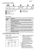 - Page 6: Control panel includes various buttons such as On/Off, Delay Start, and ExtraPower. Indicators provide information on the status of the machine, including ECO programme, rinse aid, and salt levels. The ECO programme indicator shows the most environmentally friendly programme for normally soiled loads. The rinse aid indicator activates when the rinse aid dispenser needs refilling. The salt indicator lights up when the salt container requires refilling. The Machine Care indicator signals when internal cleaning is needed. The drying phase indicator indicates when a programme with a drying phase is selected. The MY TIME selection bar allows users to choose a dishwashing cycle based on duration. The 30min programme is suitable for lightly soiled dishes. The ECO programme is the longest and most efficient for normal soil.
