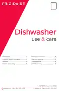 - Page 14: Care and cleaning Warning: Allow heating element to cool before cleaning the interior to avoid burns. Outer door: Clean with warm soapy water and a dishcloth or sponge. Rinse with clean water and a dry cloth. Do not use harsh cleaners. Inside: The inside of the dishwasher and filter are self-cleaning with normal use. Clean around the tub gasket area with a damp cloth if needed. Glass trap: A glass trap located in the center of the filter collects pieces of broken glass, straws, bones, and pits. Overfill protector: Keeps dishwasher from overfilling and should move up and down freely about one inch. Clean occasionally with a household cleaner containing vinegar or bleach. Glass trap removal: Pull the glass trap handle up and out to remove, empty any debris, and slide it back into position. Cleaning the interior: Use Frigidaire ReadyClean Dishwasher Cleaner tablets to clean and freshen the interior. One tablet used monthly is recommended for best results. Note: Hard water may cause lime deposit buildup on the interior of the dishwasher.