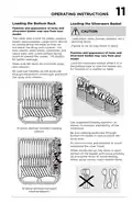 - Page 10: Operating instructions 10 place settings standard loading pattern Some models have a fold-down cup shelf or a cup shelf/stemware holder. They can be used to load two levels of cups, juice glasses, and other short items. Stagger items on upper level so that water can reach all inside surfaces. Fold up to load tall glasses. 12 place settings standard loading pattern The upper rack can be used to wash a wide assortment of items when you don’t have a full load. When the upper rack fills up with glasses and the lower rack is still empty, you don’t have to wait anymore for clean glasses. Stemware holder/cup shelf not available on all models.