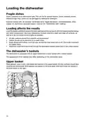 - Page 8: Loading the dishwasher Some cookware is not dishwasher safe due to high heat or damage from detergent. Exercise caution with handmade items, fragile decoration, crystal/glassware, silver, copper, tin, aluminium, wood, and plastic. Load the dishes carefully for the best washing and drying results. All dirty surfaces should face inwards and downwards. Dishes should not be placed in or on each other. Angle dishes with hollows to allow rinse water to run off. Ensure small items cannot fall through the dishwasher basket; place them in the cutlery basket. The dishwasher is equipped with an upper basket and a lower basket with a cutlery basket. Place glasses, cups, bowls, side plates, and saucers in the upper basket. Wine glasses are placed on the wine glass shelf and knives in the knife stand on the right.