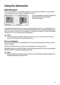 - Page 11: Using the dishwasher Add detergent Follow the instructions on the detergent packaging. This dishwasher is fitted with a water softener, so use detergent and rinse aid doses suitable for soft water. The detergent compartment must be dry when adding detergent. There is one compartment for the prewash and one for the main wash. Use only dishwasher detergent! Washing up liquid must not be used as the foam that forms prevents the dishwasher from operating effectively. Read through the directions for all-in-one detergents carefully. Activate the TAB setting when using an all-in-one detergent that contains rinse aid. Dishwasher tablets are not recommended for programs lasting less than 75 minutes. Optimal washing and drying results are achieved by using dishwasher detergent together with separately dispensed rinse aid and salt.