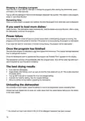 - Page 14: Stopping or changing a program involves opening the door and pressing and holding a button for three seconds. You can top up with new detergent if the lid of the detergent dispenser has opened and then select a new program. Once a program is chosen, the time it took when last used is displayed. To load more dishes, open the door, which stops the dishwasher automatically, then close the door to continue the program. In case of a power failure, the program continues when power is restored, but it will be interrupted if power is cut during drying. The end of the program is indicated by a short signal from the buzzer, and End appears on the display when the program finishes. The dishwasher switches off automatically after the program ends, and it's advised to shut off the water tap after each use. For the best drying results, fully load the dishwasher and angle dishes with hollows to allow rinse water to run off. Top up with rinse aid or increase the rinse aid dosage setting, and activate the TotalDry setting for optimal results. Unload the lower basket first to avoid water drops from the upper basket falling onto the dishes below.