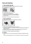 - Page 18: Care and cleaning Top up with rinse aid When the rinse aid needs topping up, the symbol lights on the display. Open the rinse aid compartment lid. Top up with rinse aid to the level marked MAX. Wipe up any splashes of rinse aid around the compartment. Top up with salt When the salt needs topping up, the symbol lights on the display. Add enough salt to fill the salt compartment (max. 750 gram). Use special dishwasher salt. In order to avoid rust stains, a dishwashing program must be started immediately after adding salt.