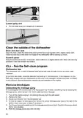 - Page 20: Lower spray arm: Pull the lower spray arm straight up to release it. Clean the outside of the dishwasher: Open the door and clean the sides of the door and the door seal regularly with a slightly damp cloth. Clean the door seal at the lower front edge of the dishwasher with a washing-up brush. Control panel: Keep the control panel clean. If necessary, wipe it with a dry or slightly damp cloth. Never use cleaning products – they may scratch the surface. Dishwasher tub: The dishwasher tub is made of stainless steel and is kept clean through normal use. If you have hard water, limescale deposits may build up in the dishwasher. Run the Self-clean program with two tablespoons of citric acid in the detergent compartment. Unblocking the drainage pump: If the dishwasher still contains water after the program has finished, something may be blocking the drainage pump. Turn off the machine and remove the plug from the wall socket. Remove the filter and scoop out the water from the dishwasher tub. Inspect the drainage pump by removing the yellow drainage pump stop and turning the pump wheel by hand.