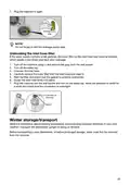 - Page 21: Plug the machine in again. Do not forget to refit the drainage pump stop. If the water supply contains small particles, the outer filter on the inlet hose may become blocked, which results in the water inlet fault error message. Turn off the machine and remove the plug from the wall socket. Turn off the water tap. Unscrew the inlet hose. Carefully remove the outer filter from the inlet hose and clean it. Store the dishwasher above freezing temperature and avoid long transport distances in very cold weather. Transport the dishwasher upright or laying on its back. Before transporting a used dishwasher, or before prolonged storage, water must first be removed from the machine.
