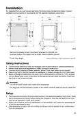 - Page 27: Installation instructions must be followed carefully. Remove plastic strips if the recess dimension is 596-598 mm. Exercise caution with sharp edges and wear protective gloves. Connections to electricity, water, and drainage must be performed by a qualified professional. Always follow applicable regulations for water, drainage, and electricity. Two people are required during installation for safety. Place a drip tray beneath the dishwasher to prevent water damage. Test the dishwasher before securing it in place by running a specific program. Turn off the water supply during installation. Ensure the installation area is firm and adjust the feet for leveling.