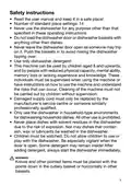 - Page 3: Safety instructions Read the user manual and keep it in a safe place. Number of standard place settings: 14. Never use the dishwasher for any purpose other than that specified in these operating instructions. Do not load the dishwasher door or dishwasher baskets with anything other than dishes. Never leave the dishwasher door open as someone may trip on it. Use only dishwasher detergent. This machine can be used by children aged 8 and upwards, and by people with reduced physical capacity, mental ability, memory loss or lacking experience and knowledge. Only use the dishwasher in household-type environments for dishwashing household dishes. Never place dishes with solvent residues in the dishwasher due to the risk of explosion. Knives and other pointed items must be placed with the points down in the cutlery basket or horizontally in other baskets.