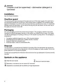 - Page 4: WARNING! Children must be supervised – dishwasher detergent is corrosive. The overflow guard starts pumping out the water and turns off the water supply if the water level in the dishwasher exceeds the normal level. If the overflow guard is triggered, F54 (Overfilling water) appears on the display. The outer packaging protects the product during transport and is recyclable. Separate the different packaging materials to help reduce raw material use and waste. The packaging is comprised of corrugated cardboard, expanded polystyrene, supports made from untreated wood, and protective plastic. The dishwasher is manufactured and labelled for recycling. When the dishwasher has reached the end of its service life, it should immediately be made unusable. Contact your local authority for information about where and how your dishwasher should be correctly recycled. Read the user manual and recycle as electrical waste.