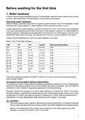 - Page 5: Before washing for the first time Water hardness In order to achieve good dishwashing results, the dishwasher needs soft water. Hard water leaves a white coating on dishes and the dishwasher. Checking water hardness Water hardness is specified using German degrees of water hardness (°dH), French degrees of water hardness (°fH), English degrees of water hardness (°eH) or millimoles per litre (mmol/l). A water supply with a water hardness in excess of 5°dH must be softened. Recommended setting If the water hardness exceeds 50°dH, we recommend connecting an external water softener. Increased consumption during regeneration The dishwasher's built-in water softener is regularly regenerated to maintain its function. Regeneration extends the dishwashing program and increases energy and water consumption. WARNING! Hard water leaves a white coating on dishes and inside the dishwasher. It is therefore important that you select the right setting for the water softener. Never run the dishwasher with an empty salt compartment if the water supply has a water hardness in excess of 5°dH.