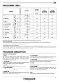 - Page 3: Programs table includes details on wash program duration, water consumption, energy consumption, and available options. Eco program is the most efficient for normally soiled tableware in terms of energy and water consumption. Intensive program is recommended for heavily soiled crockery, especially pans and saucepans. Good Night program ensures optimal cleaning and drying performance with low noise emission. Sanitizing program includes an additional antibacterial wash for normally or heavily soiled crockery. Mixed program is suitable for normally soiled dishes with dried food residues. Soak program refreshes crockery planned to be washed later without detergent. Self-Clean program is for dishwasher maintenance and should be used when the dishwasher is empty. Fast Wash&Dry program is for normally soiled crockery, providing optimal performance in a shorter time. Rapid 28’ program is for half load of lightly-soiled dishes and does not include a drying phase.