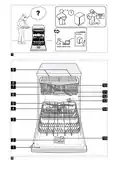 - Page 113: Informācija par izstrādājumu Ražojuma apraksts Šeit ir sniegts jūsu iekārtas sastāvdaļu pārskats. Datu plāksnīte ar E-numuru un FD-numuru. Šie dati ir vajadzīgi tehniskā servisa dienestam. Iepildiet tīrītāja kamerā tīrītāju. Apakšējā smidzināšanas lāpstiņa notīra traukus apakšējā trauku grozā. Mazgāšanas cikla laikā tabletes automātiski no tīrītāja kameras iekrīt tablešu ievietošanas tvertnē. Lai iegūtu vairāk vietas augstākiem un platākiem galda piederumiem, varat nolocīt uz leju sānu plauktus. Pirmajā lietošanas reizē vai pēc rūpnīcas iestatījumu atiestātes ir jāveic iestatījumi.
