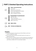 - Page 3: This manual is in two parts: Part 1 General Care and Installation and Part 2 Detailed Operating Instructions. Quick user guide provides essential information for users. Safety information outlines important precautions. Product overview gives a summary of features and specifications. Using your dishwasher includes tips for effective operation. Maintenance and cleaning covers external and internal care. Installation instruction details power connection and water supply. Connection of drain hoses is crucial for proper functioning. Position the appliance for optimal performance. Troubleshooting tips assist in resolving common issues.