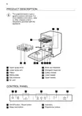 - Page 1: Product description provides a general overview of the appliance. For detailed information, refer to other chapters and documents. The graphics illustrate various components of the product, including upper and lower spray arms, filters, and the rating plate. The control panel features an on/off button, delay start button, indicators, and programme buttons.