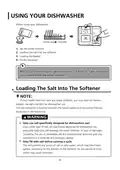 Page 11: Please follow the steps below for adding dishwasher salt. Remove the lower basket and unscrew the reservoir cap. Place the end of the funnel into the hole and pour in about 1.5kg of dishwasher salt. Fill the salt container to its maximum limit with water. The salt warning light will stop being after the salt container has been filled with salt. Immediately after filling the salt into the salt container, a washing program should be started. The salt container must only be refilled when the salt warning light in the control panel comes on. If there is no salt warning light in the control panel, you can estimate when to fill the salt into the softener by the cycles that the dishwasher has run. If salt has spilled, run a soak or quick program to remove it.
