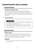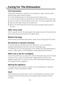 Page 17: Caring for the dishwasher includes frost precautions in winter. After washing cycles, cut off the electrical power and turn off the water supply. Drain the water from the inlet pipe and water valve. Remove the filter at the bottom of the tub and soak up water in the sump. After every wash, leave the door slightly open to prevent moisture and odors. Always remove the plug from the socket before cleaning or maintenance. Do not use solvents or abrasive cleaning products on the dishwasher. Run a wash cycle with the dishwasher empty if not in use for a long time. Keep the appliance in a vertical position when moving it. Periodic cleaning of seals with a damp sponge prevents odors.