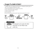 Page 47: Forget to add a dish can be addressed before the detergent dispenser opens. To add a forgotten dish, pause the washing by pressing the Start/Pause button. Wait 5 seconds before opening the door to add the forgotten dishes. Close the door and press the Start/Pause button after 10 seconds to resume the cycle. Opening the door mid-cycle is dangerous due to hot steam that may scald you.